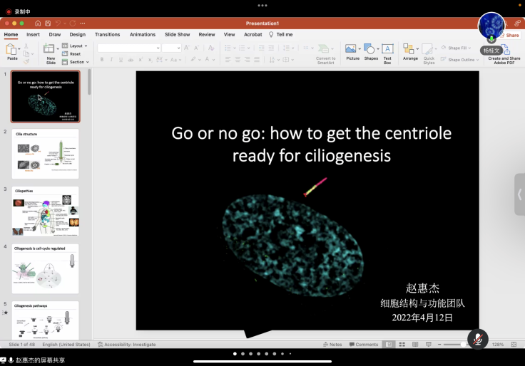 在报告中,赵惠杰分享了其所在的“细胞结构与功能团队”在纤毛发生调控机制方面的最新研究成果。首先,他简要介绍了进化上高度保守的细胞器——纤毛。纤毛是突出于大多数哺乳动物细胞表面的毛发状结构。在纤毛形成的起始阶段,中心体向基体的转变,定位于母中心粒远端的一些纤毛形成负调节分子,如CP110-CEP97蛋白复合物,需要从母中心粒远端移除,从而启动纤毛形成。团队博士生宋婷等人通过运用多种显微成像方法以及基因敲除等技术发现,ENKD1是一个具有中心体定位的蛋白,该蛋白能通过与CEP97竞争结合CP110,从而调控母中心粒CP110-CEP97蛋白复合物的移除。同时研究发现,ENKD1基因敲除小鼠表现出多种遗传性纤毛病相关表征,进一步证实了ENKD1在纤毛形成过程中发挥了重要作用。最后,在互动交流环节,线上的老师及同学们踊跃提问,当被问及一些实验的具体细节问题,他提到,“科研的过程是一个由浅入深,逐渐发现问题并解决问题的过程,切忌盲从。”